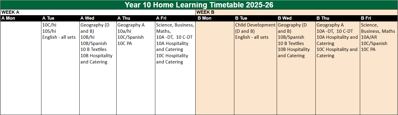 For Years 10 - 11, examination subjects will set one Home Learning task per week. Each will take up to 60 minutes to complete.