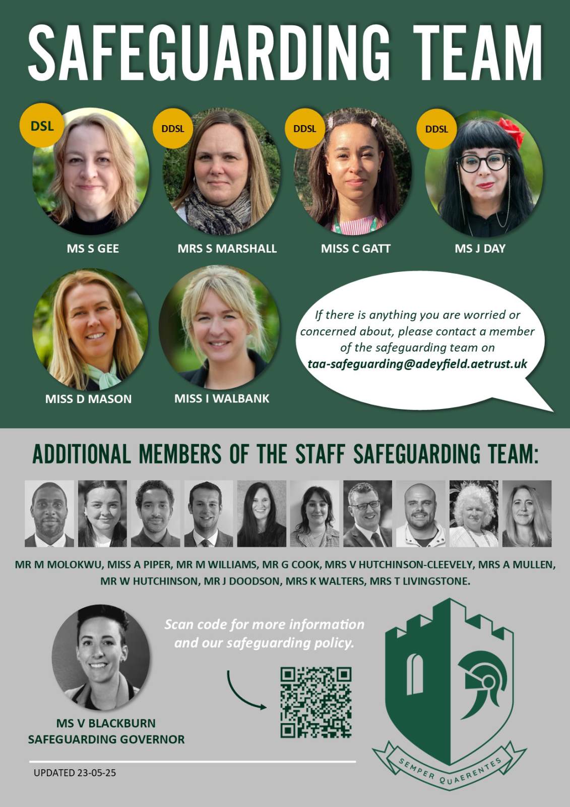 If you have any concerns about your own child or any other child at The Adeyfield Academy, please notify one of the following staff members on: 01442 406020 / taa-safeguarding@adeyfield.aetrust.uk